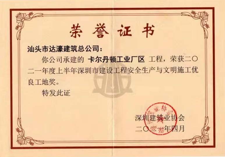 2021年度上半年深圳市建設工程安全生產與文明施工優良工地獎